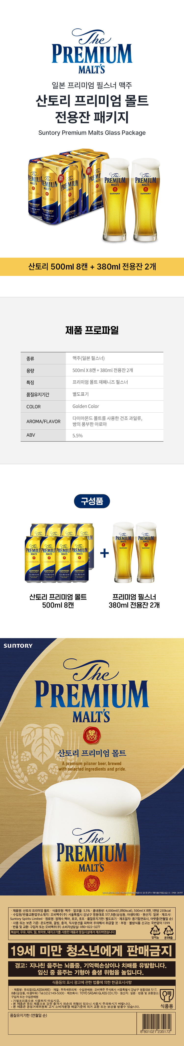 산토리 프리미엄 몰트 캔 500ml 8캔 + 전용잔 2개